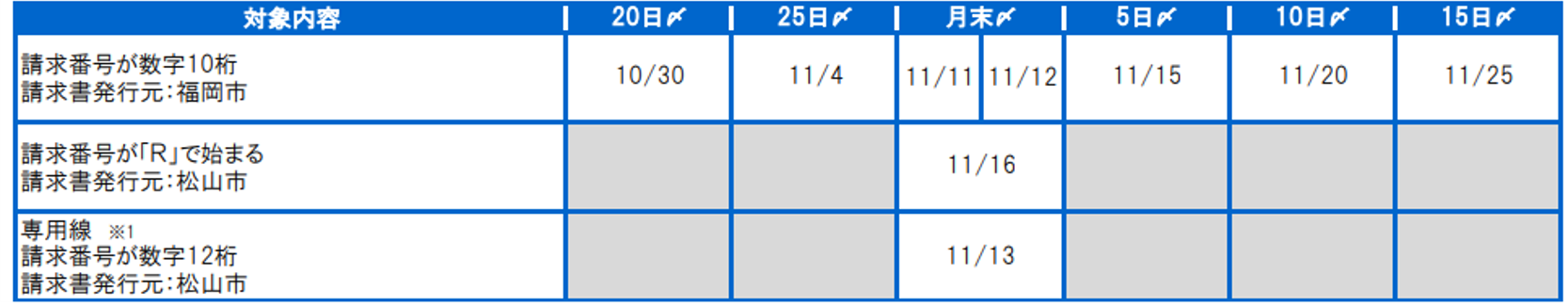 適格請求書のデータ接続日について、従来は請求期間(お支払期限)に応じて表示設定をしておりましたが、変更後は請求期間(お支払期限)に加えて支払方法に応じた表示設定へと変更になります。請求書の場合、現在と変更はありません。口座振替とクレジットの場合は、現在よりデータ接続日が数日あとになります。