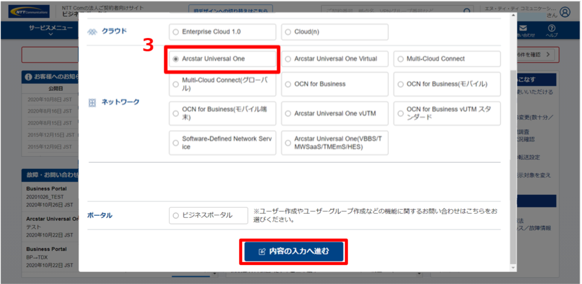 (3)お問い合わせしたいサービス名を選択し、「内容の入力へ進む」をクリックします。