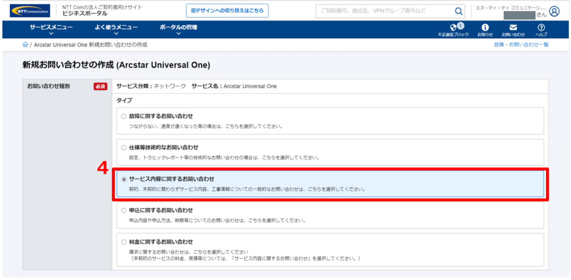 (4)お問い合わせ種別は「サービス内容に関するお問い合わせ」を選択します。
