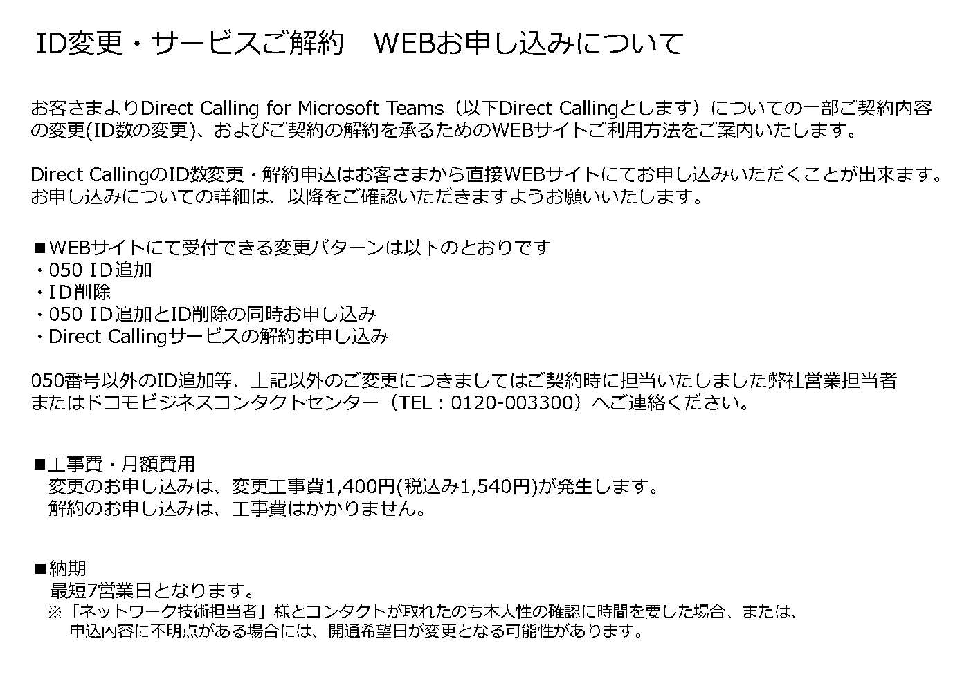 ■Direct Calling for Microsoft TeamsのID追加・ID削除・サービス解約のWEBお申し込みは